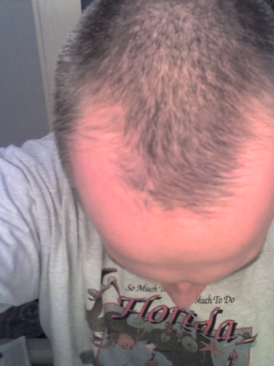 Das hab ich bis vor kurzem ziemlich gelassen hingenommen, aber mittlerweise haben meine Geheimratsecken derartige Ausmaße angenommen, daß man jeder von ihnen ne eigene Postleitzahl geben könnte (ich versuche mal, hier ein Foto von meinem derzeitigen Haarstatus reinzupacken...das Wort kannte ich vor kurzem noch garnicht Smile Sorry, daß es ein wenig unscharf ist, aber es ist ziemlich knifflig, seinen eigenen Kopf mit ner Handykamera zu knipsen )