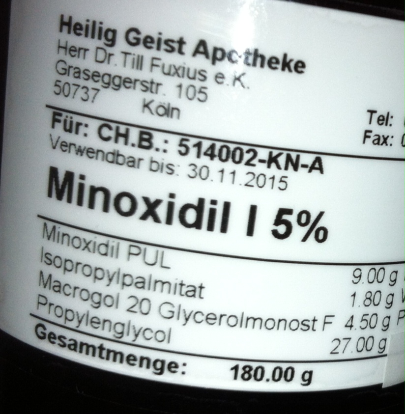 Naja ich würde nur gerne wissen, ob dies ein normales Minox Rezept ist oder ob da etwas drin ist, was nicht in Regaine und Co enthalten ist. Habe ein Foto von der Flasche angehängt. Auf der anderen Seite ist noch Wasser und Ethanol gelistet. Habe 40EUR für 180ml zahlen müssen.