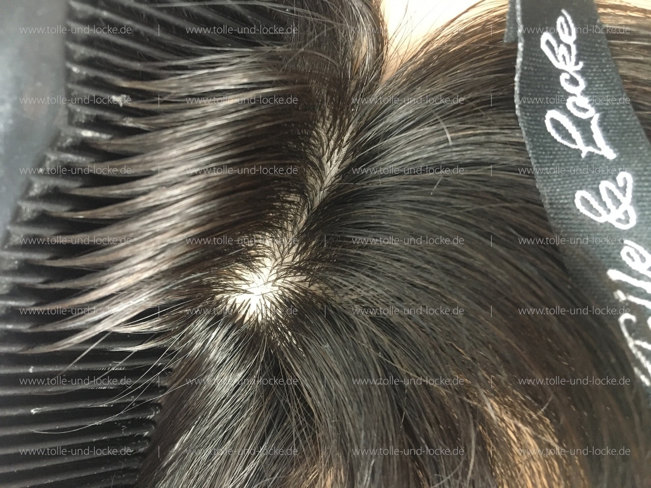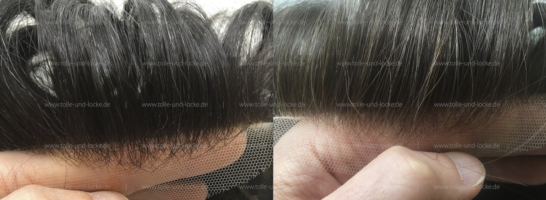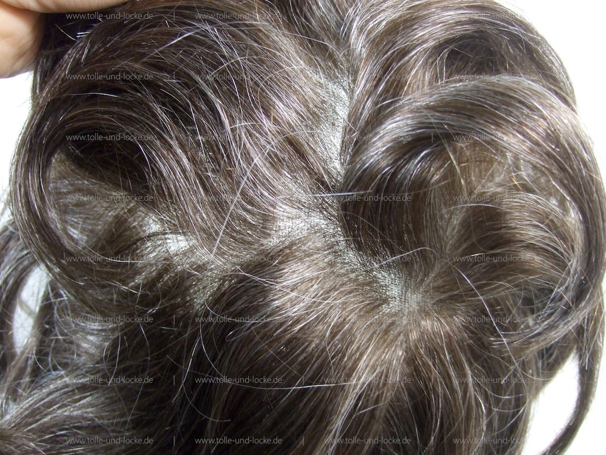 Au dem zweiten Foto ist ein Kopfhautimitat im vorderen Oberkopfbereich sichtbar, das einen stets bevorzugten Mittelscheitel natürlicher wirken lässt.