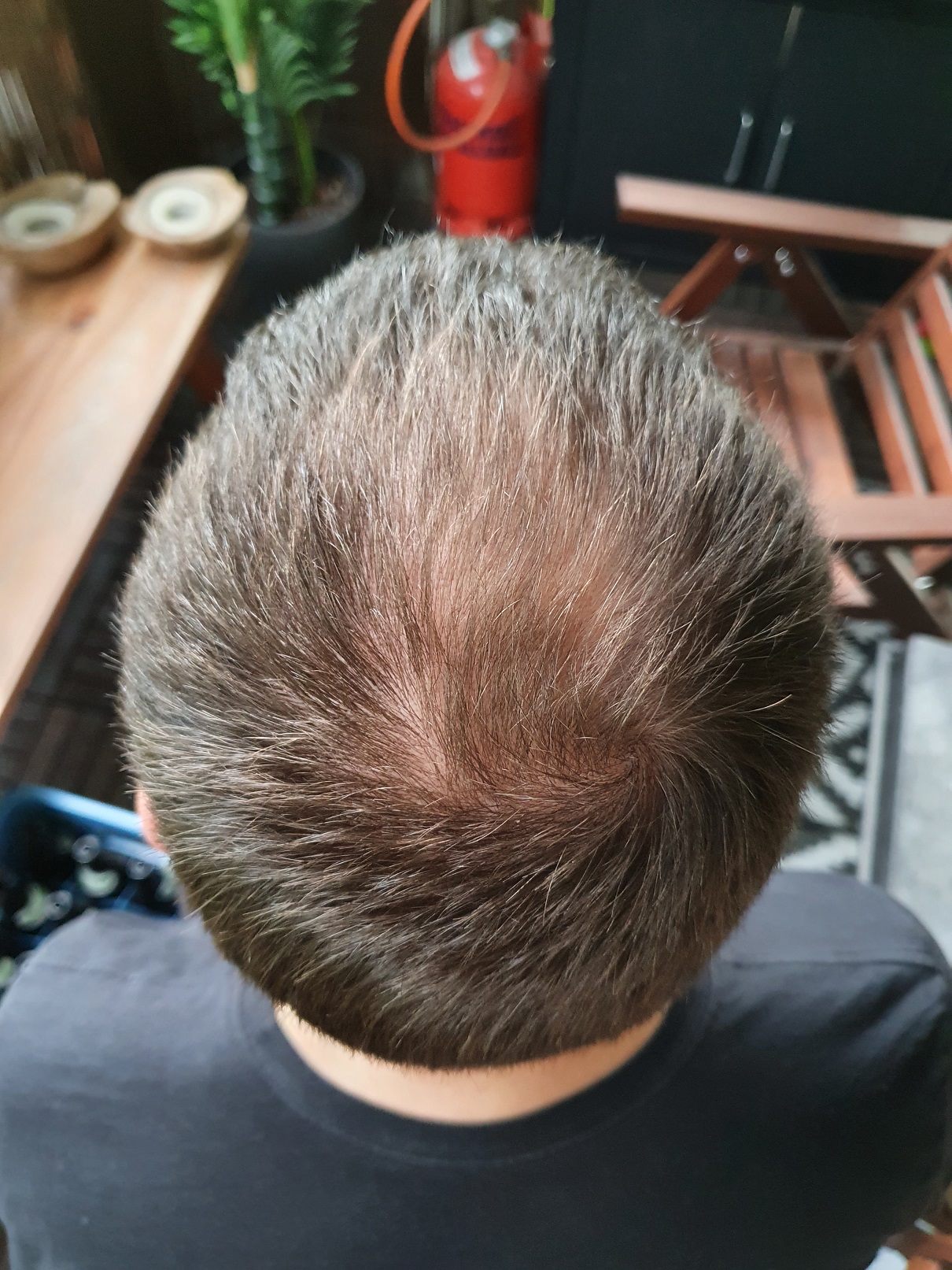 Jetzt habe ich das Gefühl, dass sich in den letzten sechs Monaten der Haarstatus meiner Tonsur deutlich verschlechtert hat. Entweder liegt das einfach nur daran, dass durch meine neue Kurzhaarfrisur der Tonsurbereich einfach deutlicher zu sehen ist oder ich hatte in den letzten sechs Monaten einen deutlichen Haarausfallschub - trotz Minoxidil. Damit komme ich auch gleich zu meiner Frage: Wirkt Minoxidil bei mir und sollte ich es weiterhin nehmen?