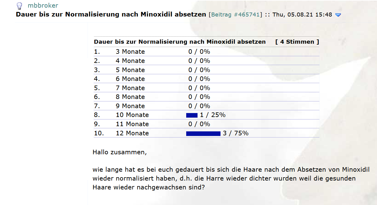 Aw: Dauer bis zur Normalisierung nach Minoxidil absetzen [Beitrag #479656 ist eine Antwort auf Beitrag #465741] :: Mo., 15 August 2022 21:50