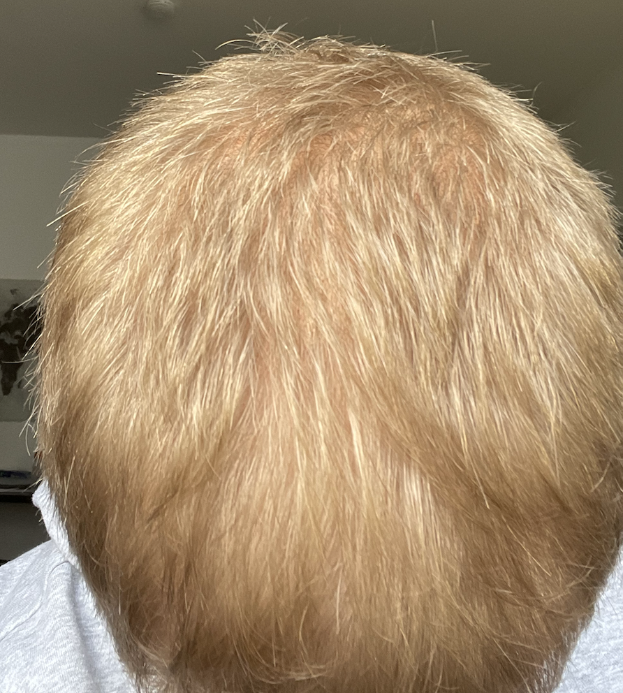 Ausfallmuster ist sehr diffus, manche Areale haben stark Dichte verloren (Haarlinie, Oberkopf), andere nur ein paar cm weiter noch relativ dicht