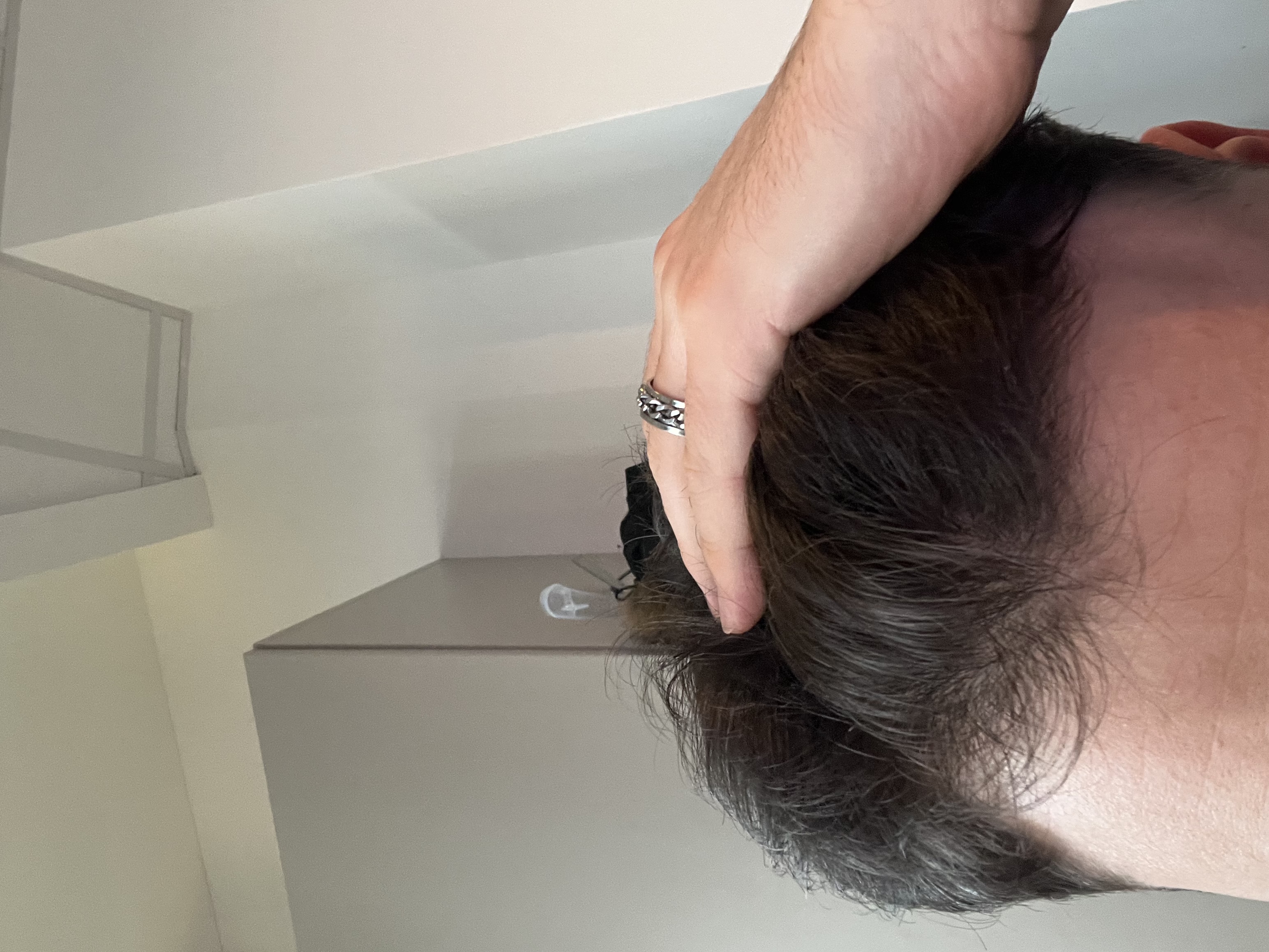 Haaransatz deutlich schwach geworden. Muss sagen hatte im letzter Zeit auch viel Stress. Oben sind die Haare gott sei dank top. Geheimratsecken hatte ich schon vor Fin.
