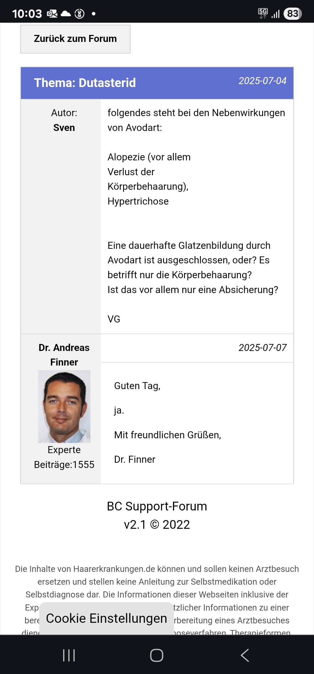 Aw: Nebenwirkung von Dutasterid: Haarausfall [Beitrag #516253 ist eine Antwort auf Beitrag #516196] :: Mo., 07 Juli 2025 10:05 Zum vorherigen Beitrag gehen
