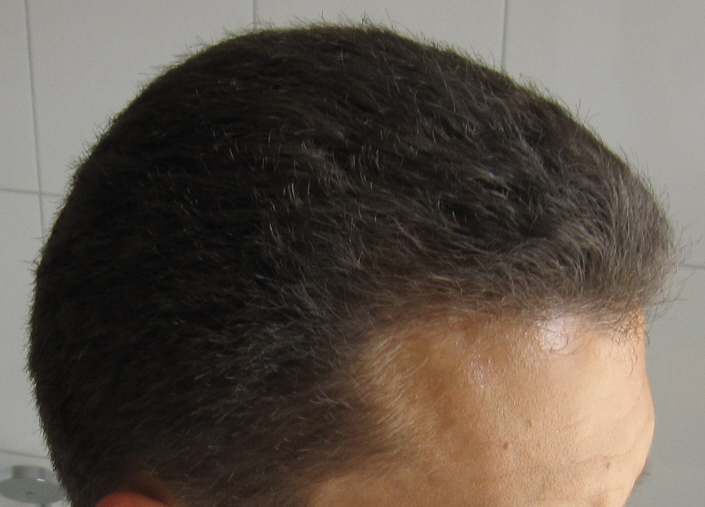 Zu Beginn würde ich den Rest-Haarstatus an der Front auf 40% und an der Tonsur auf 55% schätzen.