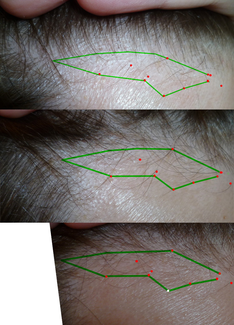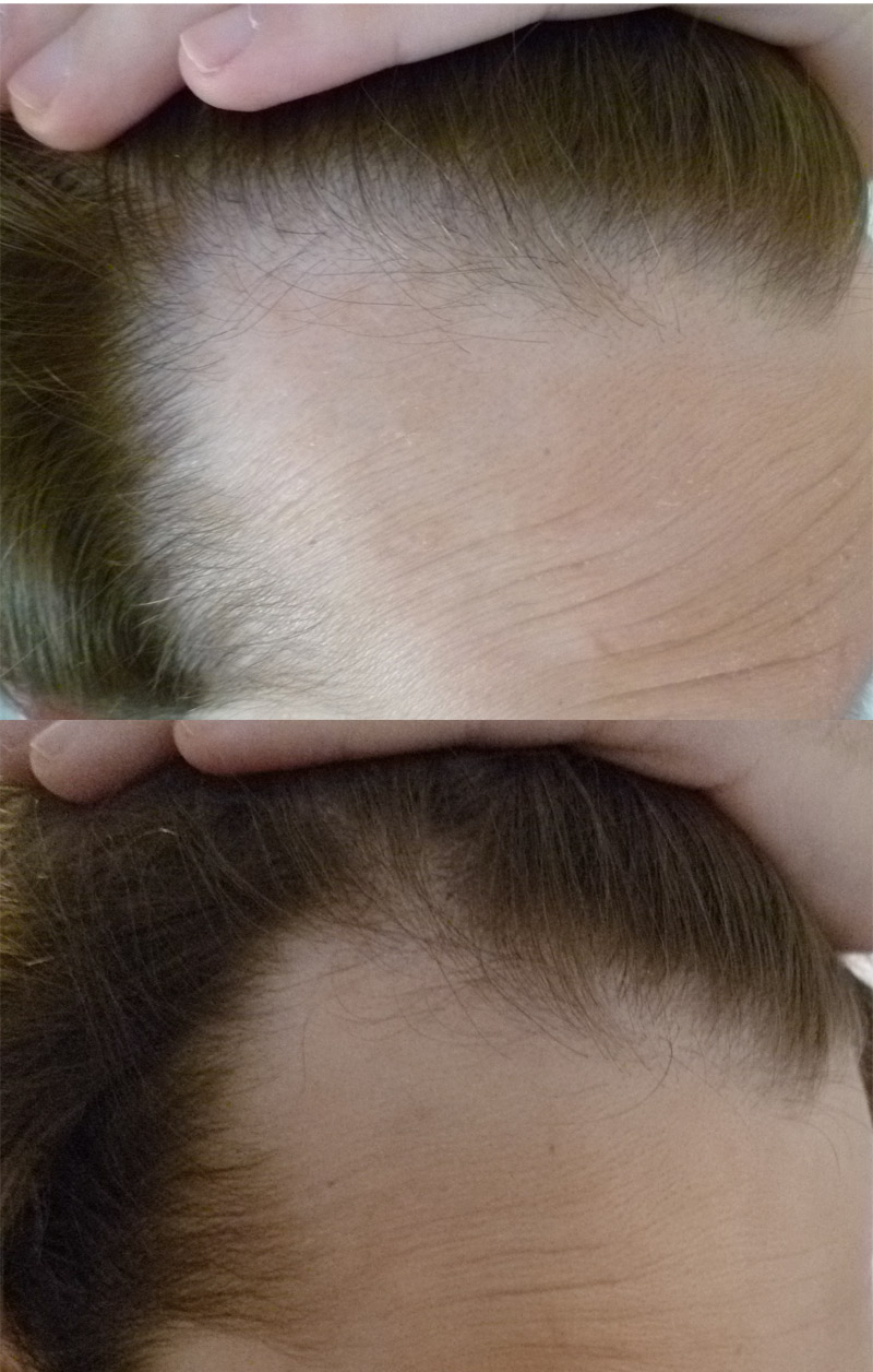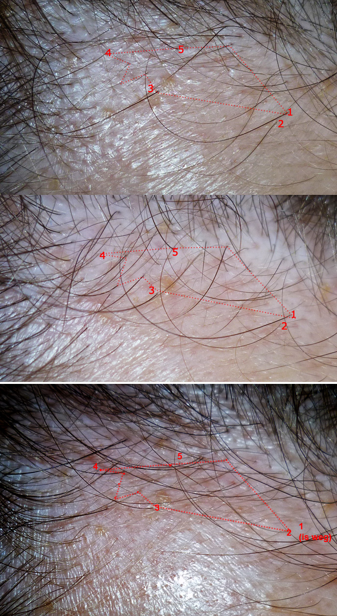 PS: Inzwischen mache ich wieder monatliche Abgleichungen mit dem Ausgangsbild. Ich habe nämlich das Gefühl, dass die Haare am Haaransatz, die einst farblos und kaum zu sehen waren, immer dunkler und dichter geworden sind. Will schauen, ob sich der Trend vortsetzt.