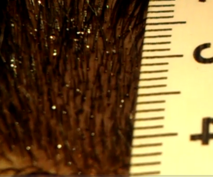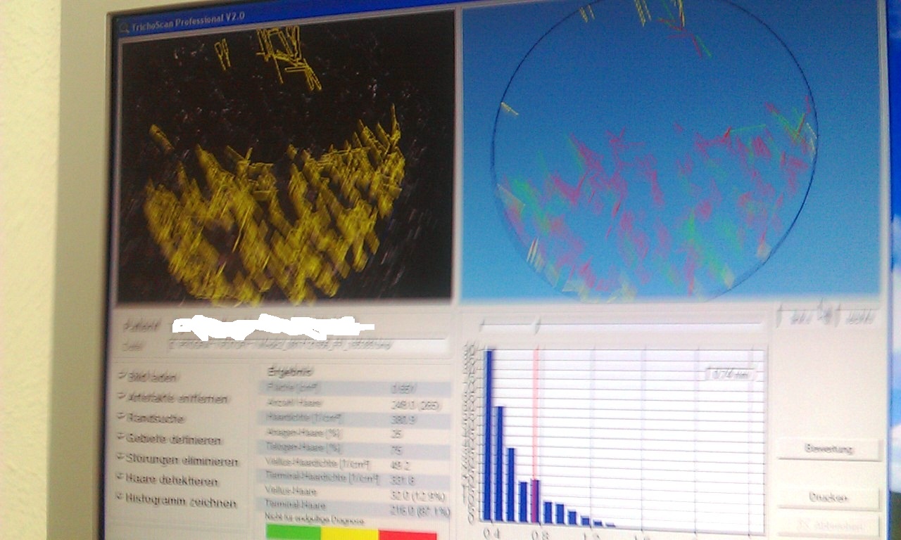Bezüglich meines Trichoscan kommt mir der Gedanke, dass es bei beiden schlechten Ergebissen nach dem anfärben und dem saubermachen die Stelle nicht angfeuchtet wurde. Denke ja auch dass was nicht stimmt. aber könnte dieses derart schlechte ergebns daran liegen dass die Haare "standen" und nicht angefeuchtet "lagen" und daher kürzer erscheinen, da ja von oben fotographiert wird? Wunschdenken oder könnte was dran sein, zumal in der Anleitung steht, dass die Haare angefeuchtet werden sollen.