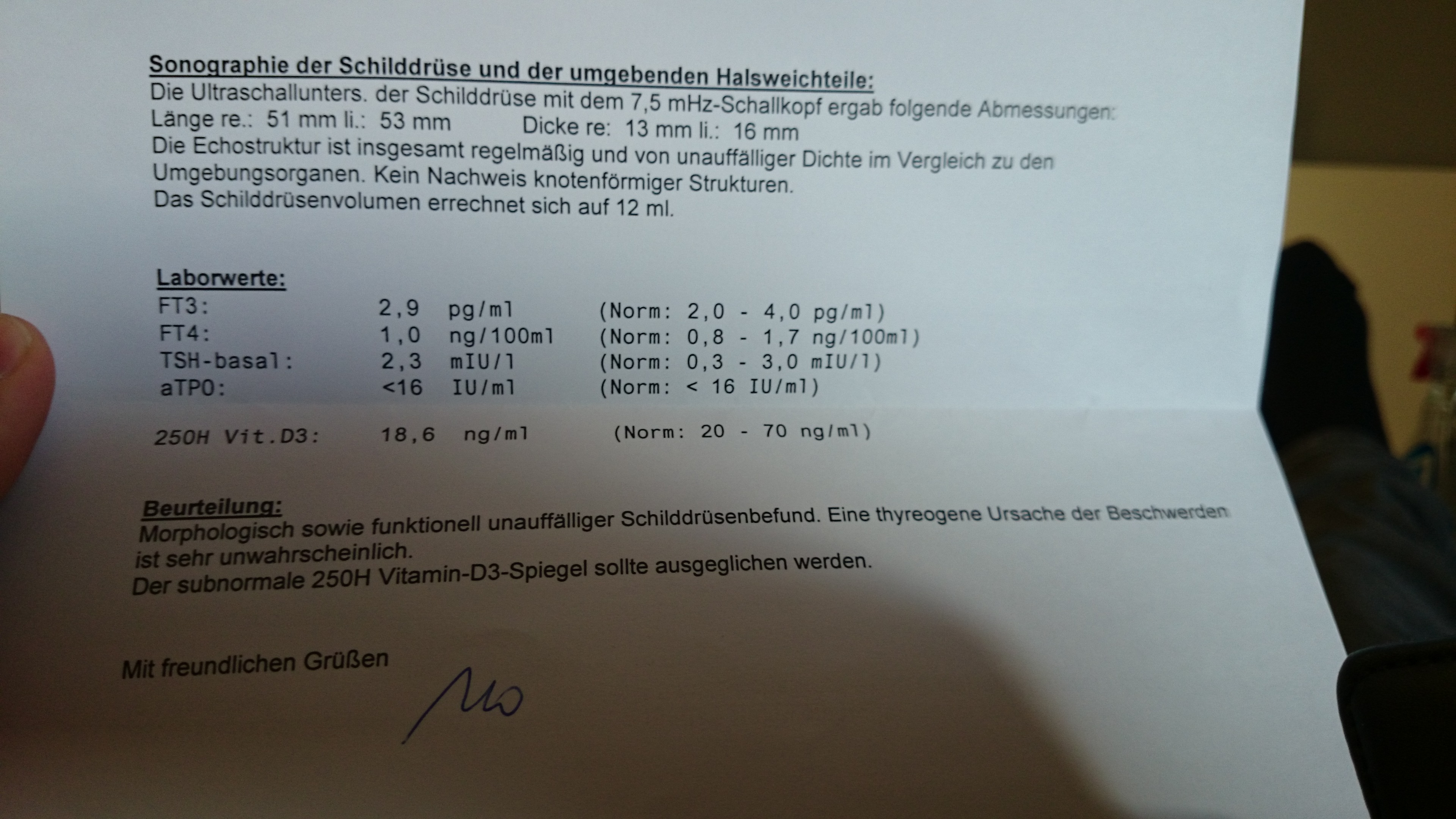Bin froh nun eine Ärztin gefunden zu haben, die mich und meine Symptome ernst genommen hat und auch wirklich Ahnung zu haben scheint, was die Schilddrüse angeht. Aber es ist doch echt traurig, dass es selbst unter den Endokrinologen viele Ärzte gibt, die sich in der Thematik viel zu wenig auskennen.
