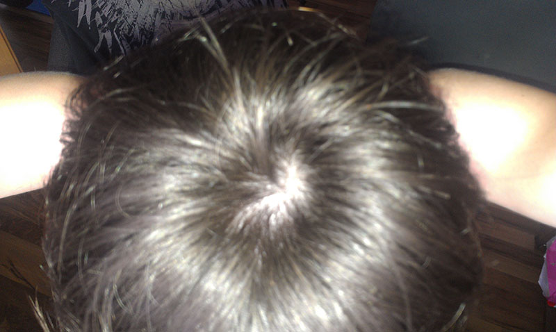 Da sieht man doch das es kein Wirbel mehr ist, "weill" es ist zwar ein Scheitel, aber man sieht das um den Scheitel herum die Haare viel mehr ausgedünnt sind, sie sind nicht mehr so dicht, und es sieht doch aus wie eine entwickelnde Tonsur.
