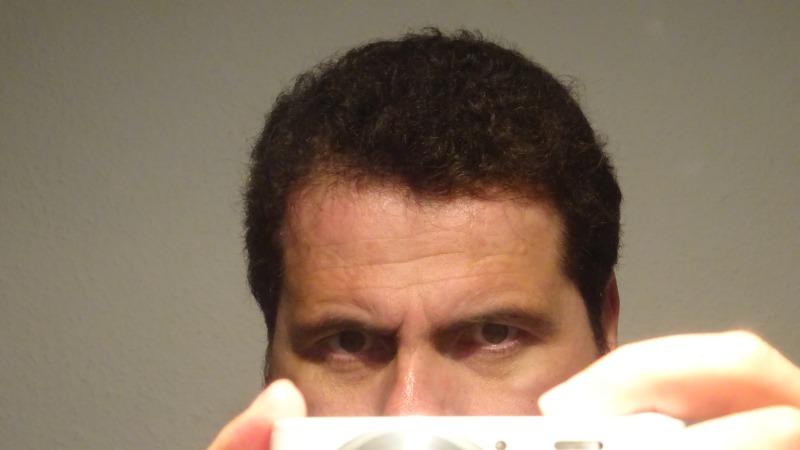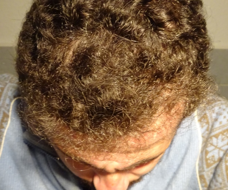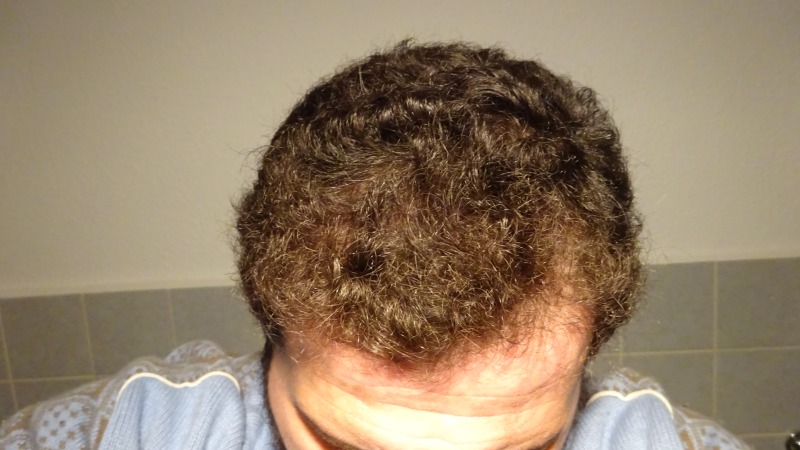 Nach frisch Duschen wieder sind diese Lücken im Oberkopf zu sehen. Die Lampe ist nur 30 cm über dem Kopf und direkt. Nicht gut.