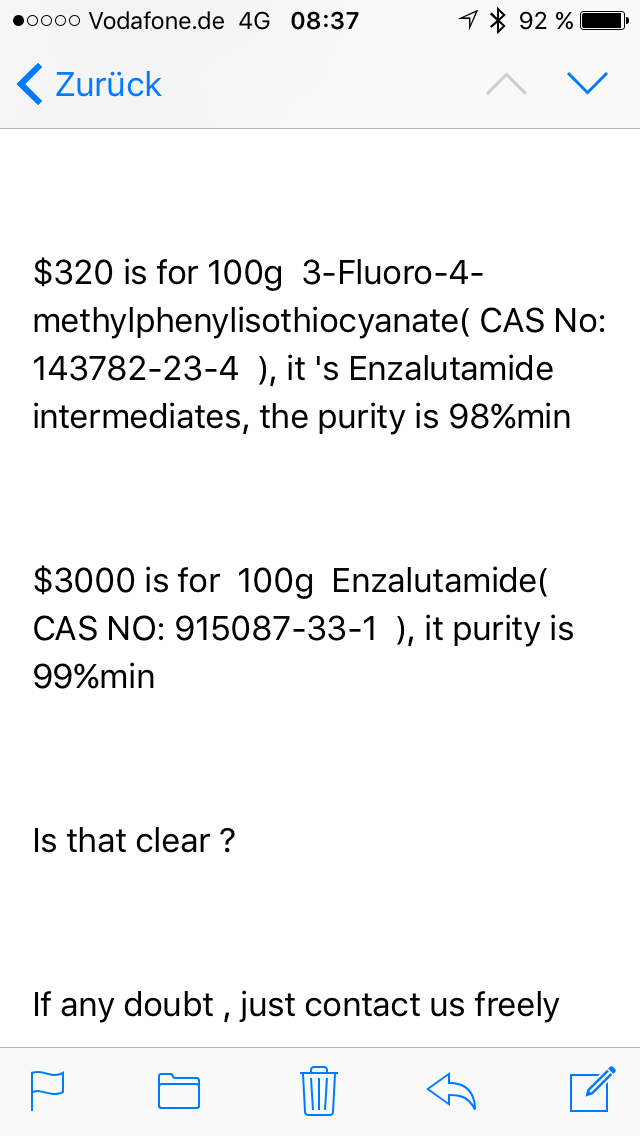 Habe heute mein Enza bekommen. Um zu testen, ob es zumindest echt sein könnte, habe ich versucht etwas in DMSO und anschließend etwas in PEG-400 zu lösen. In DMSO hat sich das Enza problemlos gelöst, in PEG-400 löst es sich nicht.
