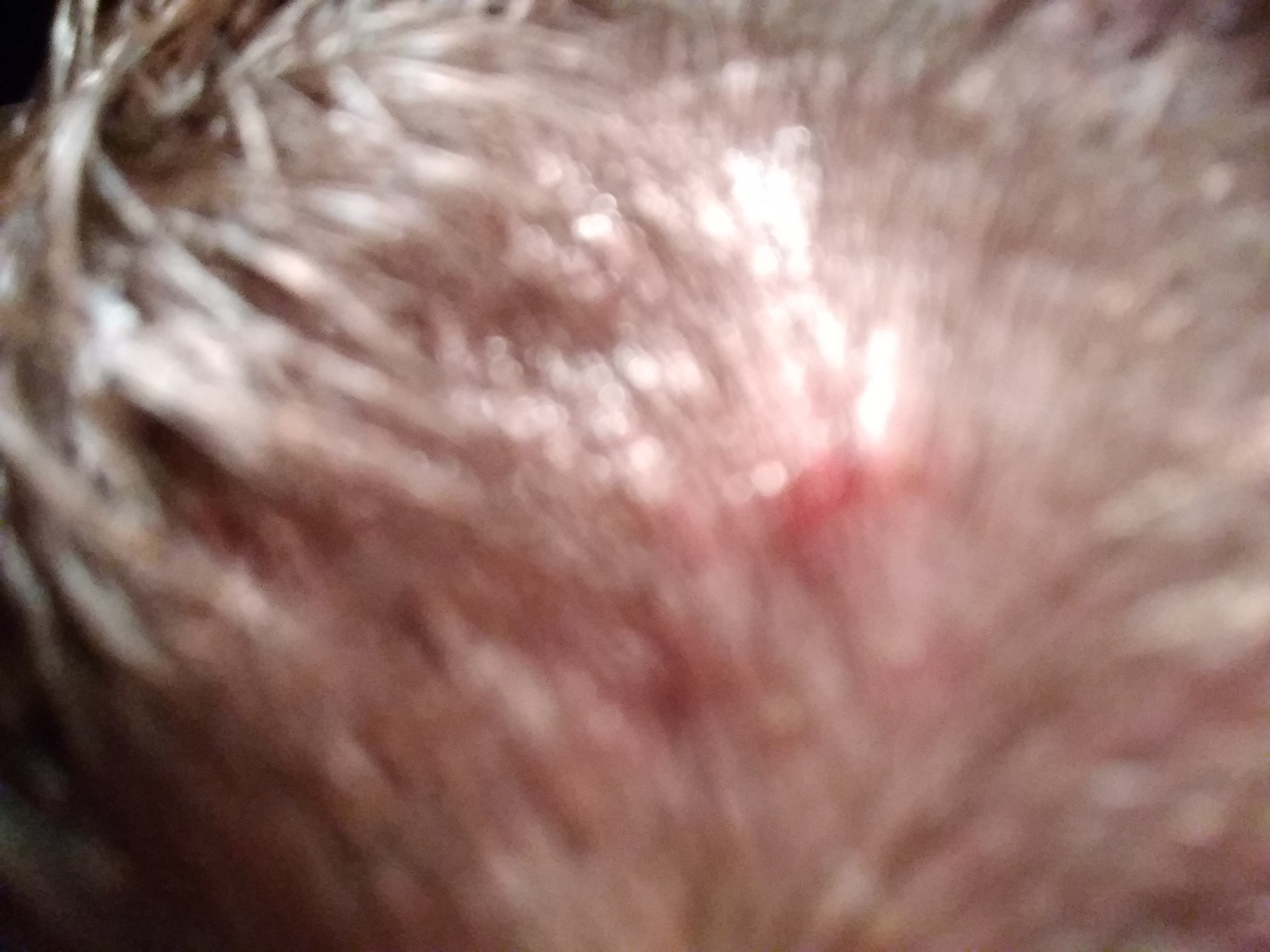 Teilweise etwas gerötet die stirn, wobei ich nicht weiß ob das vielleicht vom kratzen kommt. Aber eben nicht die gesamte kopfhaut.