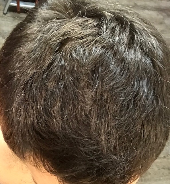 Wenn man Fotos vom Oberkopf macht, gerade beim mm Schnitt wo die Haare leicht abstehen, schaut man ja teils direkt auf die Spitzen und zu den Seiten hin liegen sie ja wieder mehr, wodurch sie aus dieser Perspektive mehr deckungskraft haben.