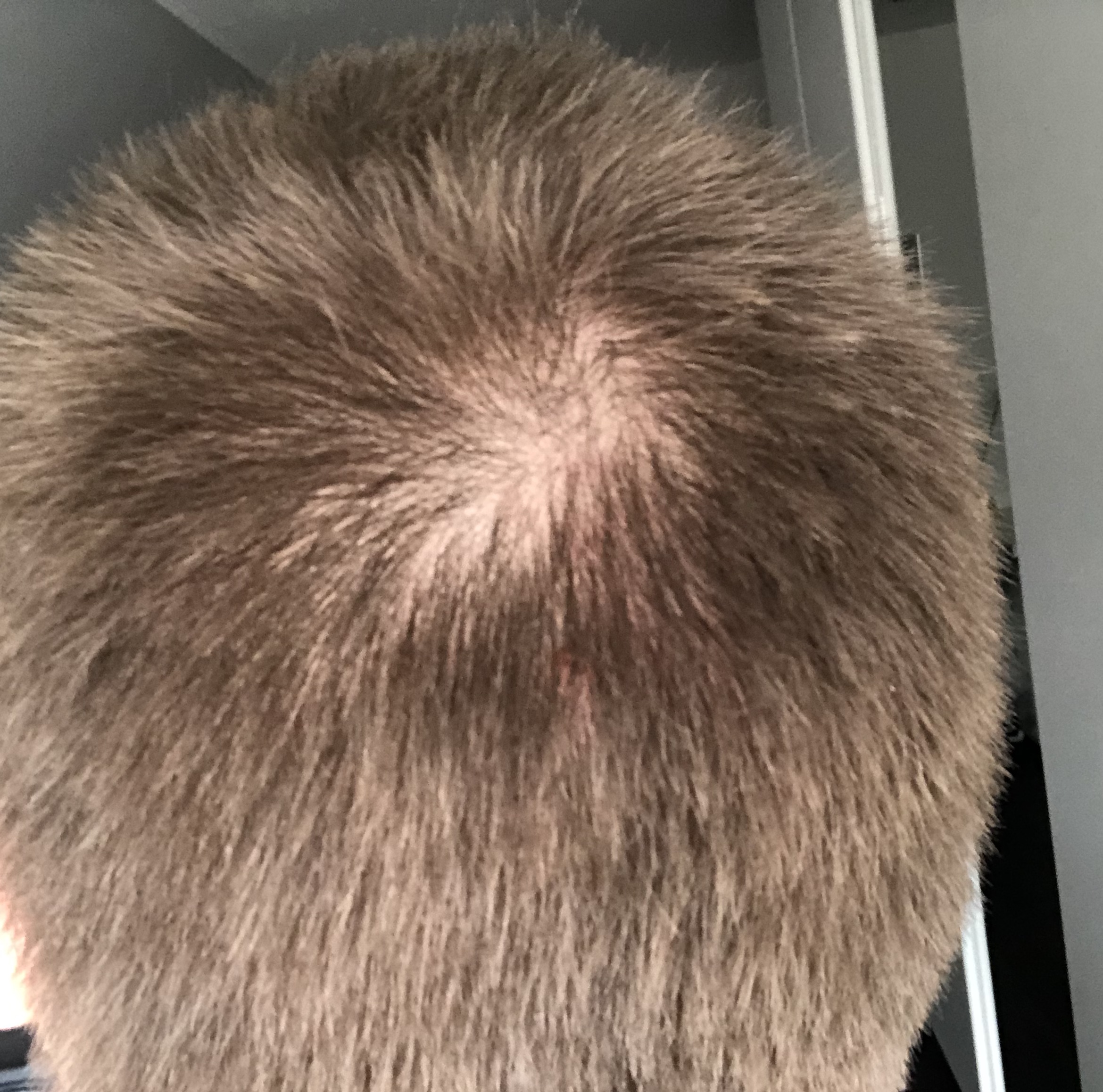 Besonders hier am Wirbel da war bis vor 1 Monat NIE ein Kahles Loch. So eine Kahle Stelle zieht sich genauso da oben lang wo der Rote strich hinführt , wie oben auf den Ersten Bild.