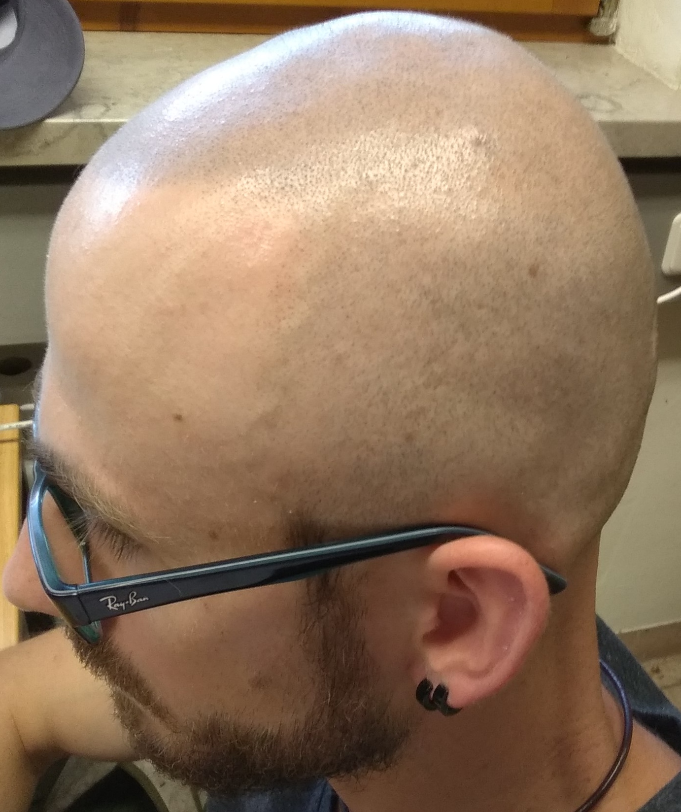 Hab hier noch zwei brandaktuelle Bilder von vor zwei Minuten angehängt. Hier siehst du, dass das Resthaar mittlerweile zu lang ist (am Kranz), wenn man genau hinsieht. Muss jetzt dann noch rasieren!