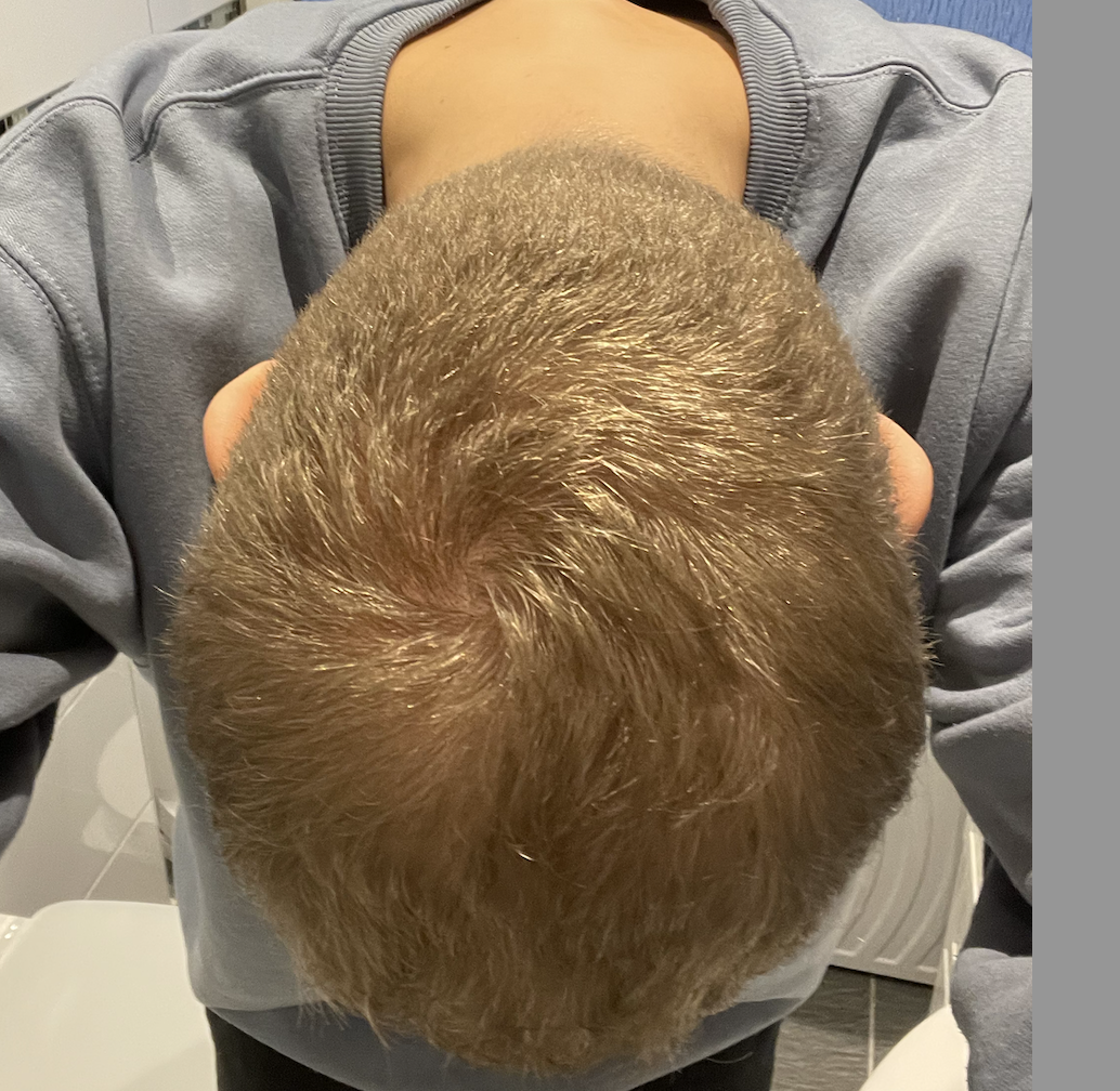 Ausfallmuster ist sehr diffus, manche Areale haben stark Dichte verloren (Haarlinie, Oberkopf), andere nur ein paar cm weiter noch relativ dicht