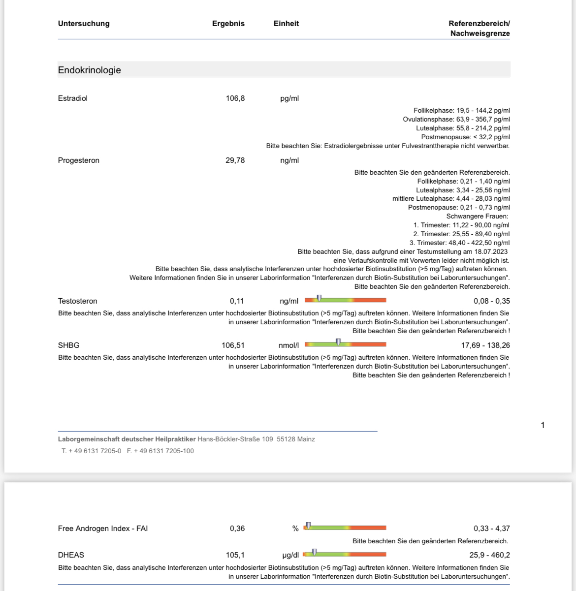 Hallo Rico, ja das habe ich gemacht. Gerade am Montag war ich nochmals und sobald ich die Ergebnisse habe teile ich sie hier. Hormone hatte ich bislang über Speichel mal gemessen. Aber ist das überhaupt aussagekräftig oder besser über Blut? Im Speichel hatte ich zu viel Testo, zu viel Östrogen und zu wenig Progesteron.
