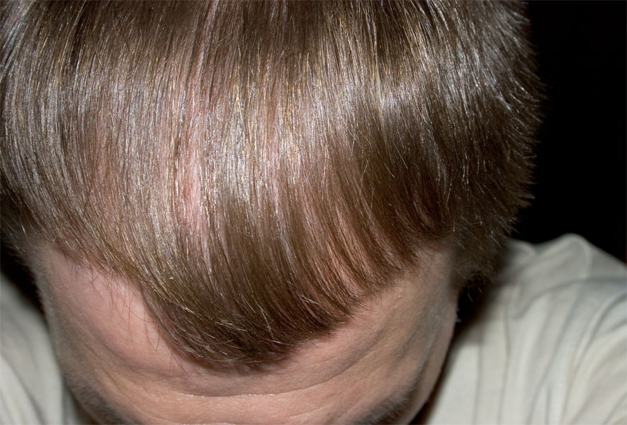 Wenn ich die paar Fuseln die von hinten nach vorne reichen zurückkämme dann ist hinter dem Stirnansatz fast gar nichts mehr!